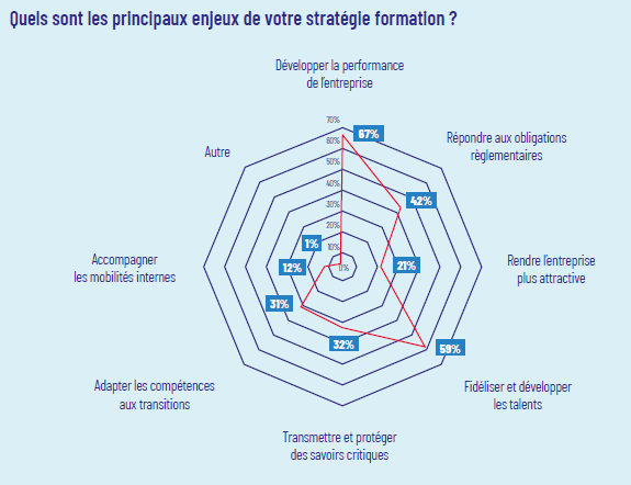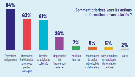 La priorité des employeurs reste la montée en compétences des salariés en poste (24 %), suivie du développement de l’alternance (22 %) et de la formation des nouveaux entrants (17 %). Ces choix traduisent une conviction forte : la formation n’est pas seulement un outil d’adaptation, mais aussi un levier de fidélisation et d’intégration.