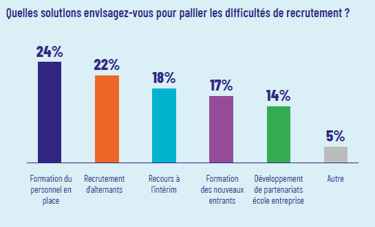 Pour y faire face, 76 % des entreprises envisagent de recourir à la formation, aussi bien pour développer les compétences internes que pour intégrer des profils plus éloignés de l’emploi cible.